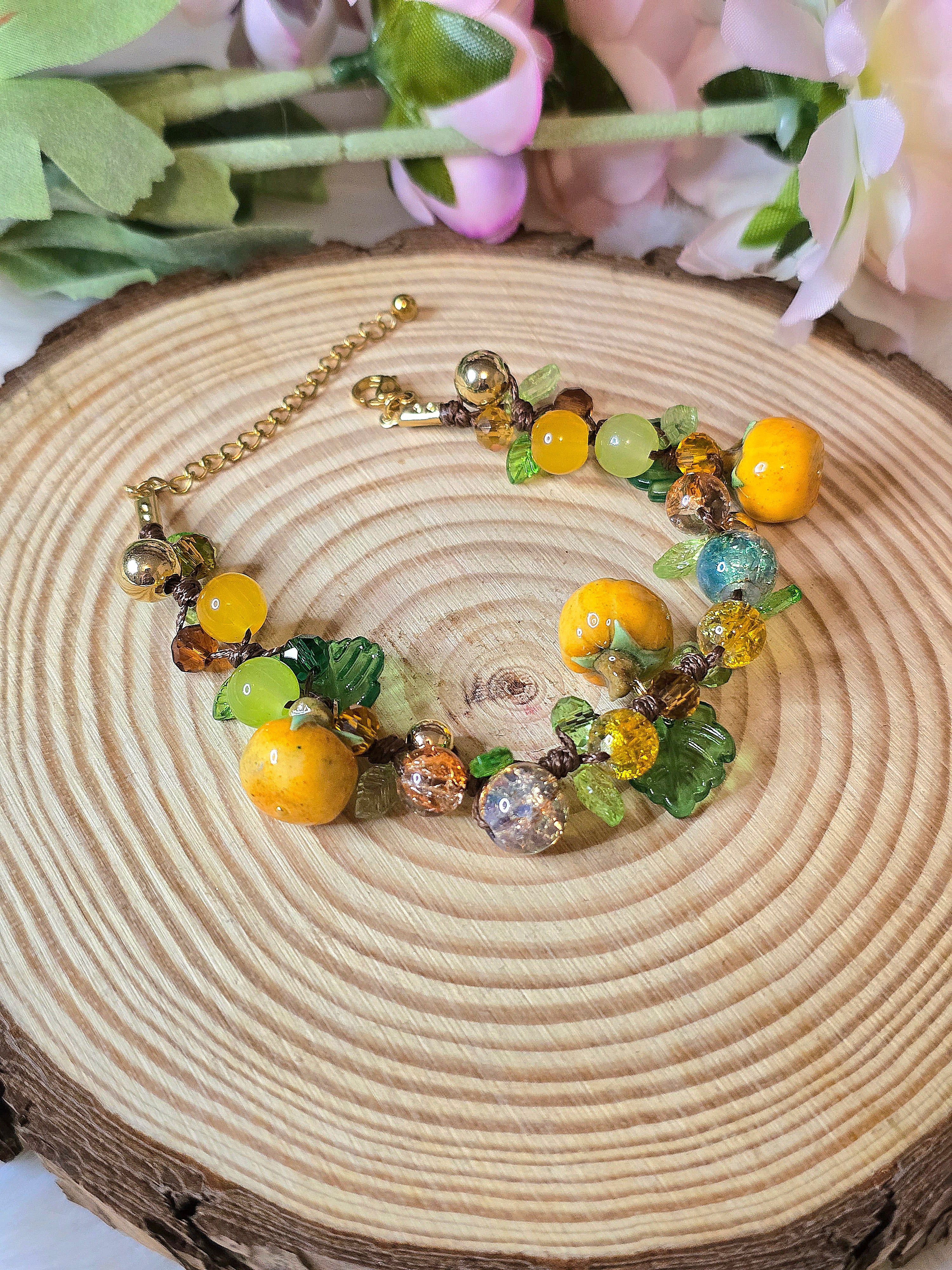 Bracelet fait main composé de perles en verre et pâte polymère.