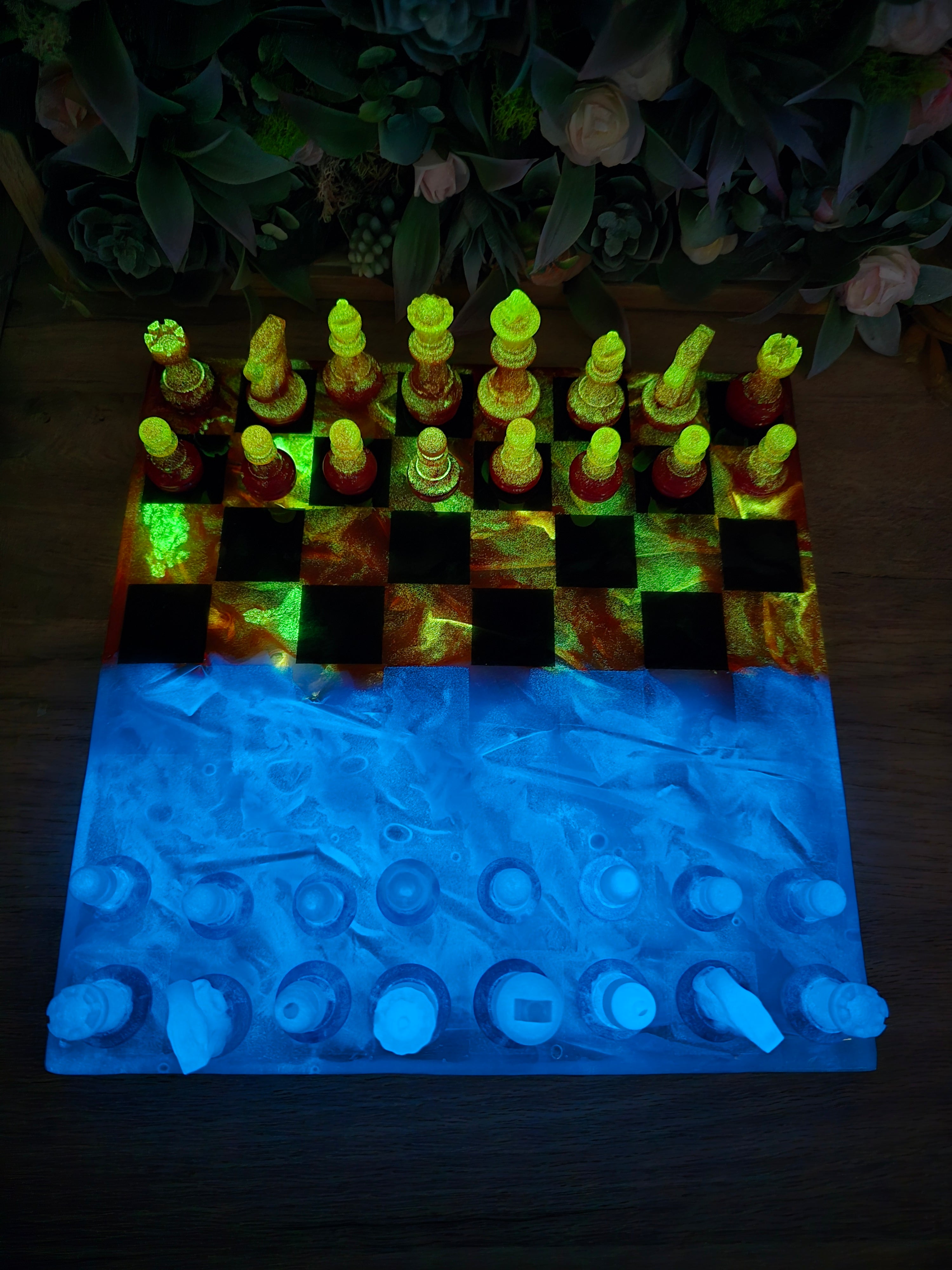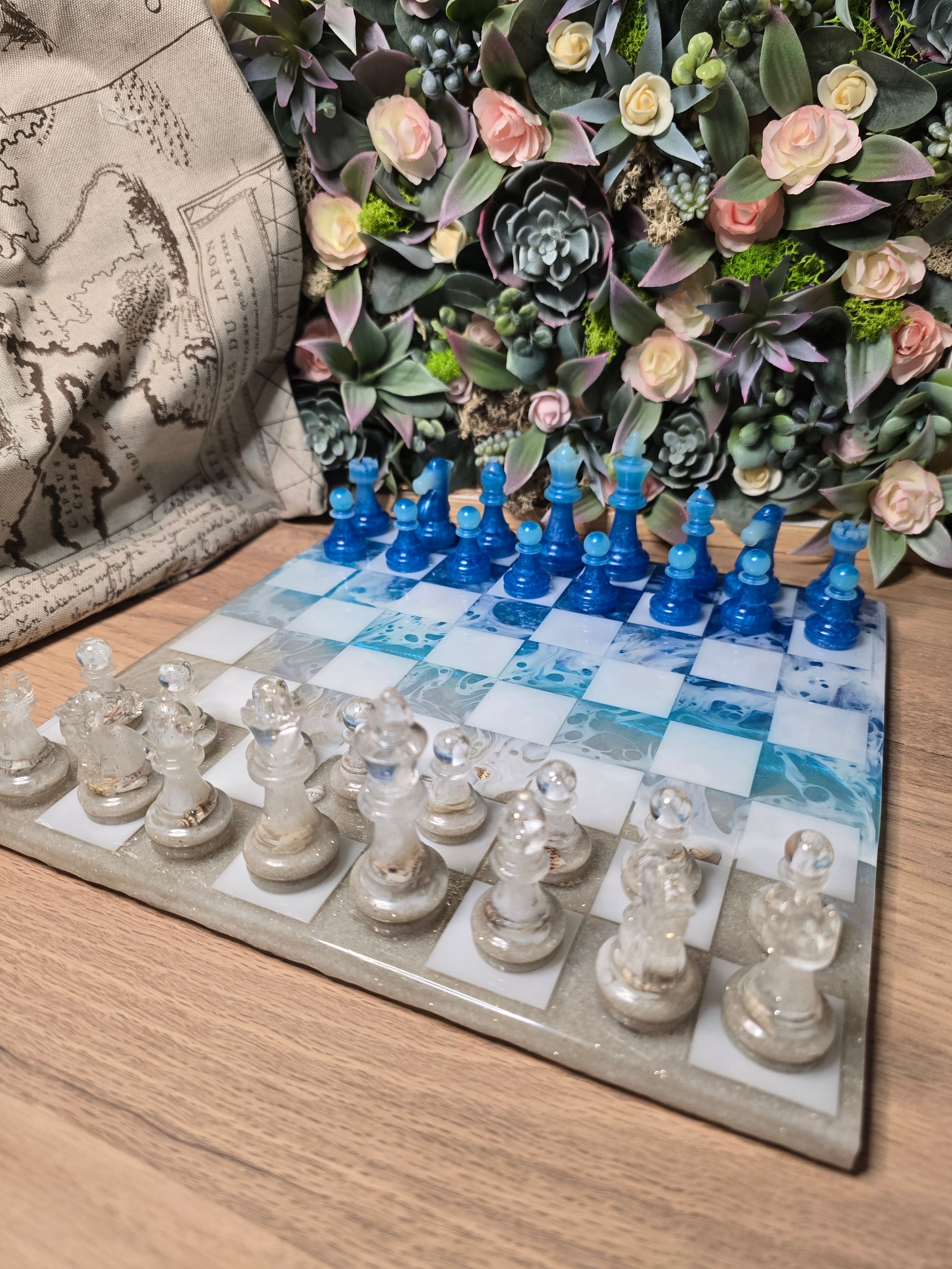 En résine époxy avec 32 pions assortis, ainsi que deux pochettes en tissu assorti cousues main, 1 pour l'échiquier, 1 pour les pions.