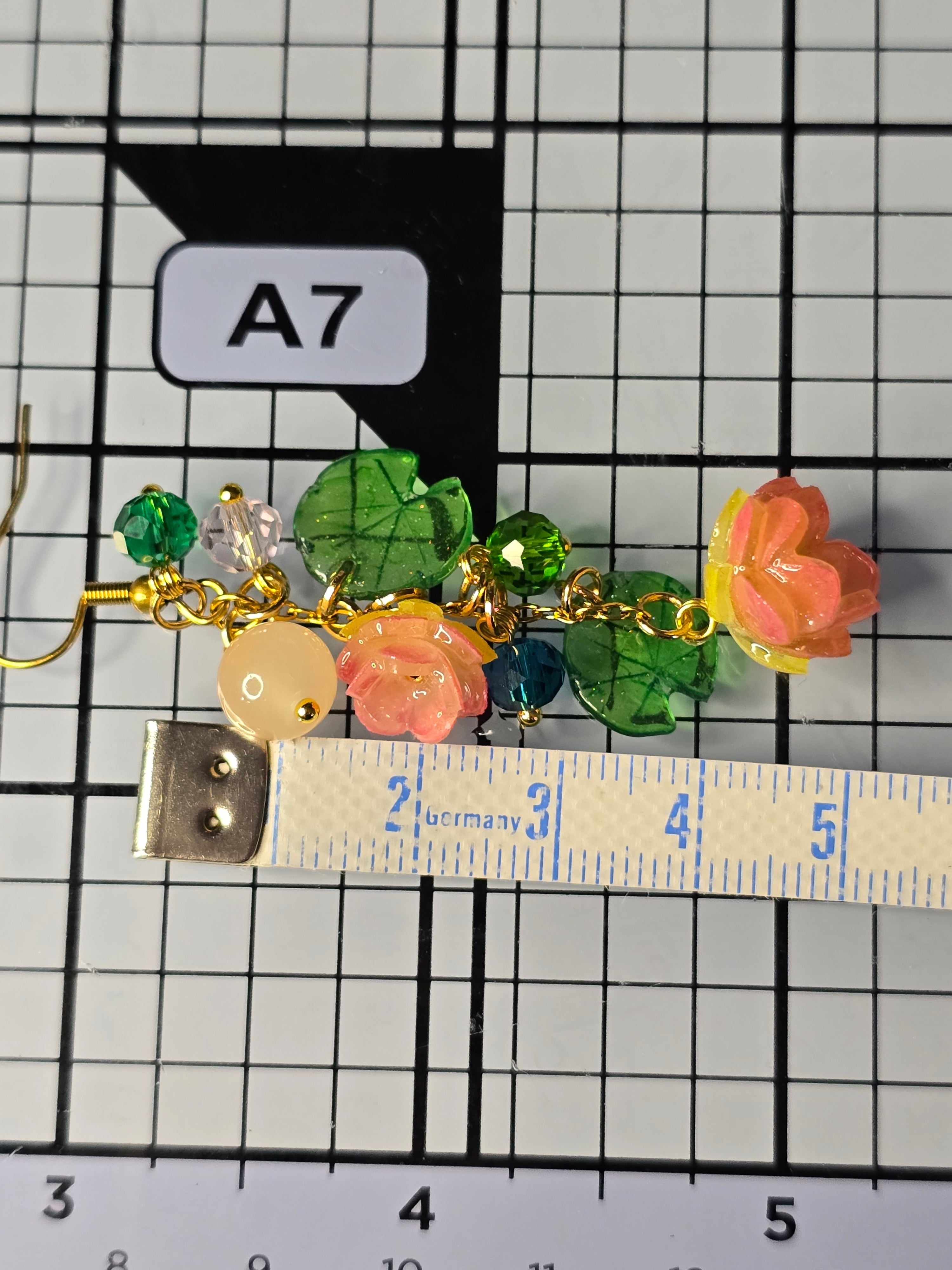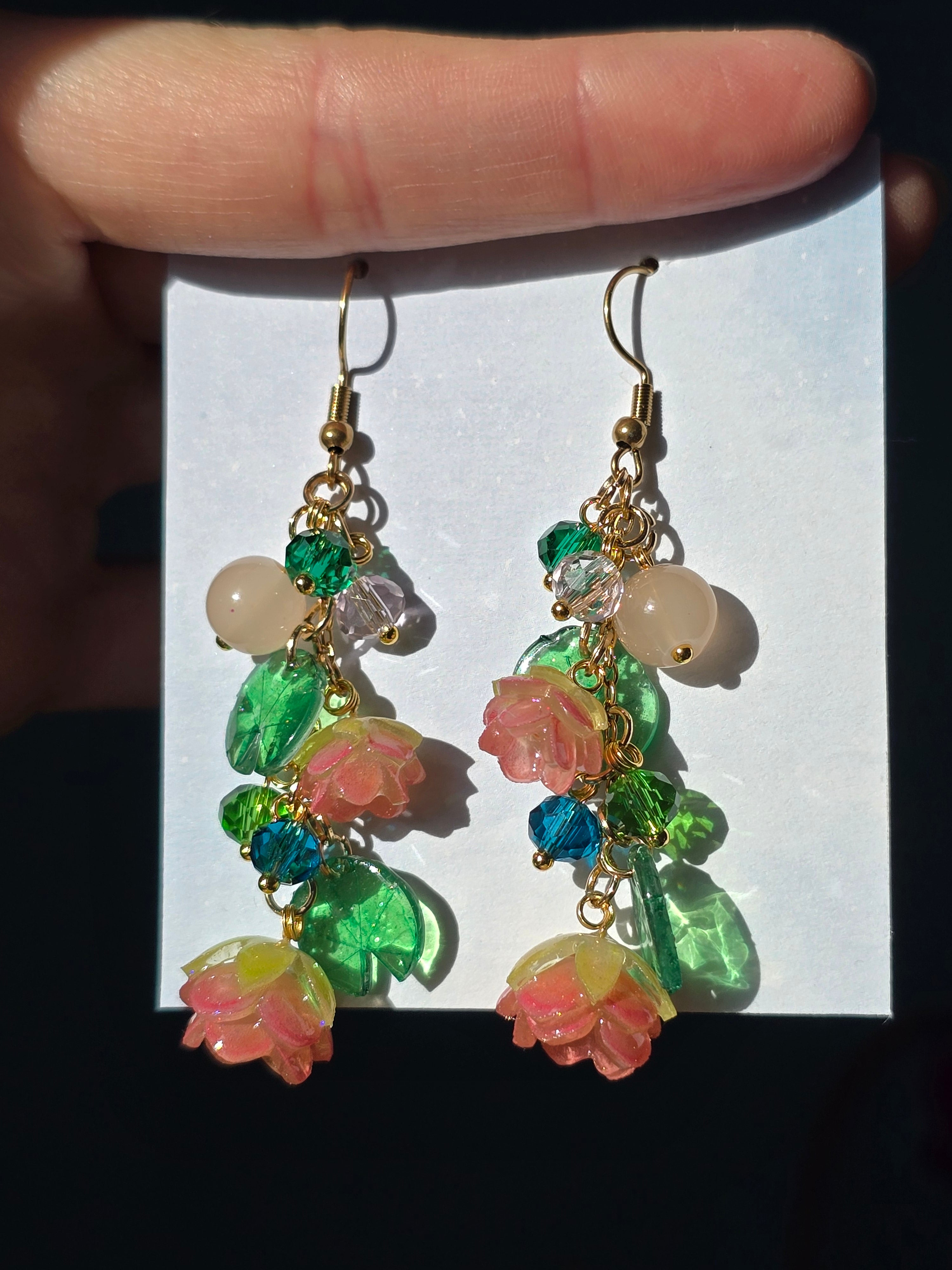Boucles d’oreilles inspiration Nénuphar, réalisées avec des perles en verre et en résine.